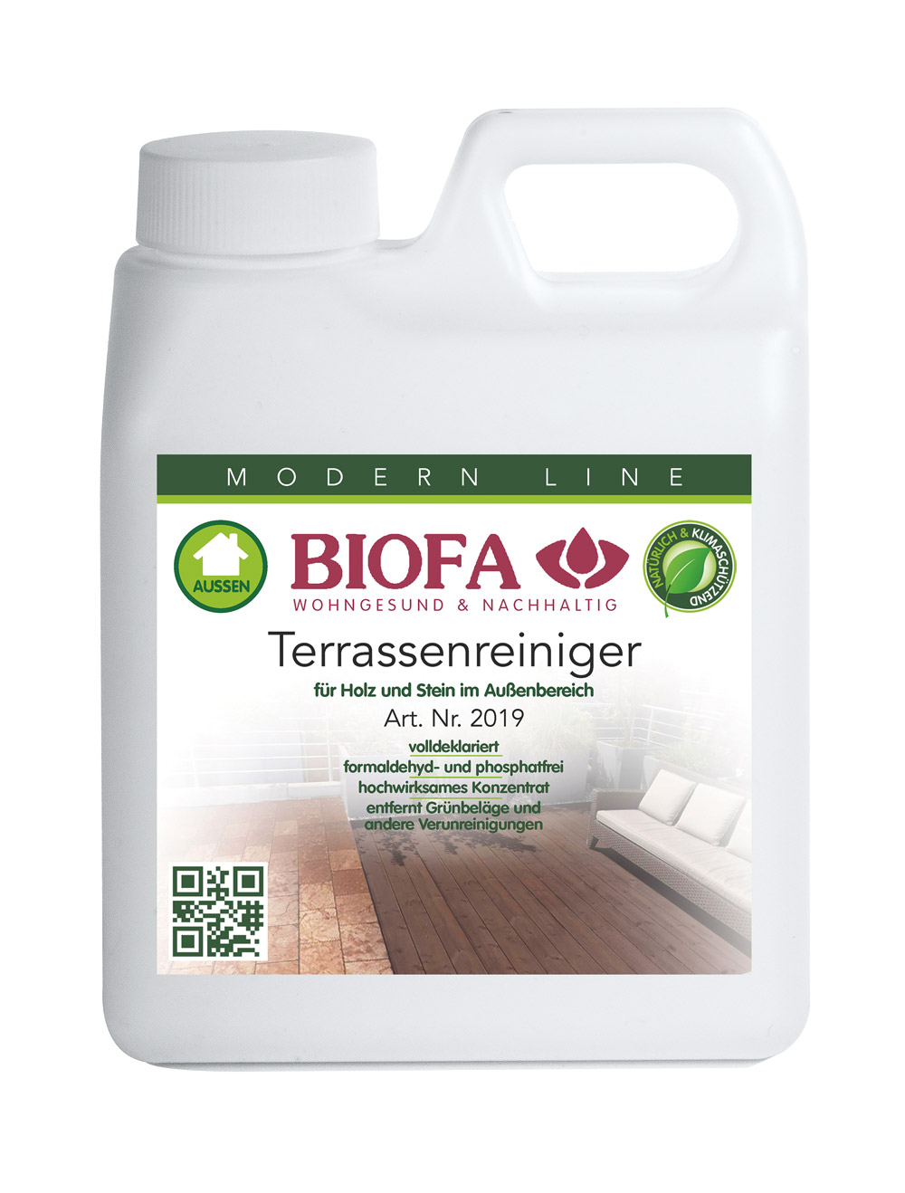 Der BIOFA Terrassenreiniger ist ein biologisch abbaubarer, hochwirksamer Intensivreiniger und Grünbelagsentferner für Terrassenoberflächen, Sichtblenden, Gartenmöbel, Pergolen, etc. aus unbehandeltem oder geöltem Holz im Außenbereich. Sehr gut eignet er sich auch für Oberflächen aus Kunststoff und Verbundwerkstoffen, sowie Stein, Beton, Waschbeton, Eternit, Dachziegel, Gehwegplatten geeignet. Dieser starke und vielseitige Reiniger ist frei von Chlor, Salmiak, chemischen Konservierungsmitteln, Phosphaten und Formaldehyden.