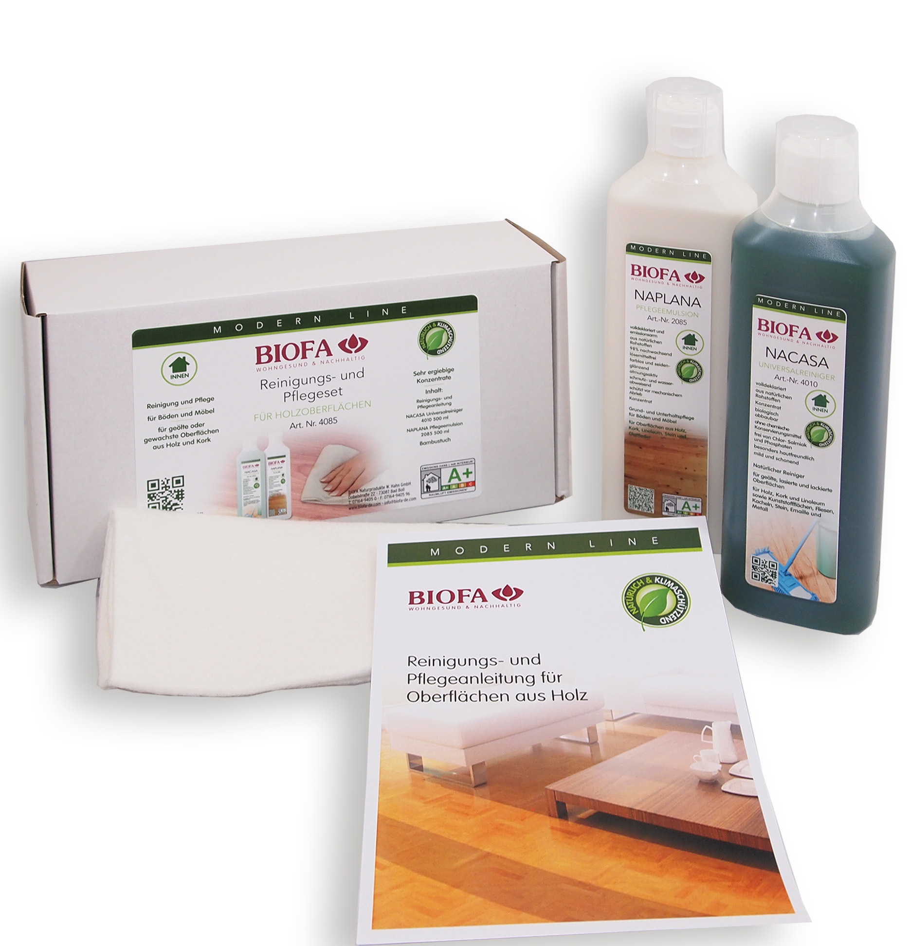 Eine sorgfältige Reinigung und Pflege z. B. durch den Einsatz des BIOFA Reinigungs- und Pflegesets sind wichtige Maßnahmen, um die Qualität und Schönheit der natürlichen Holzoberflächen dauerhaft zu erhalten, ob auf geölten oder gewachsten Holzböden, Möbeln, Küchenarbeitsplatten oder sonstigen entsprechenden Oberflächen.