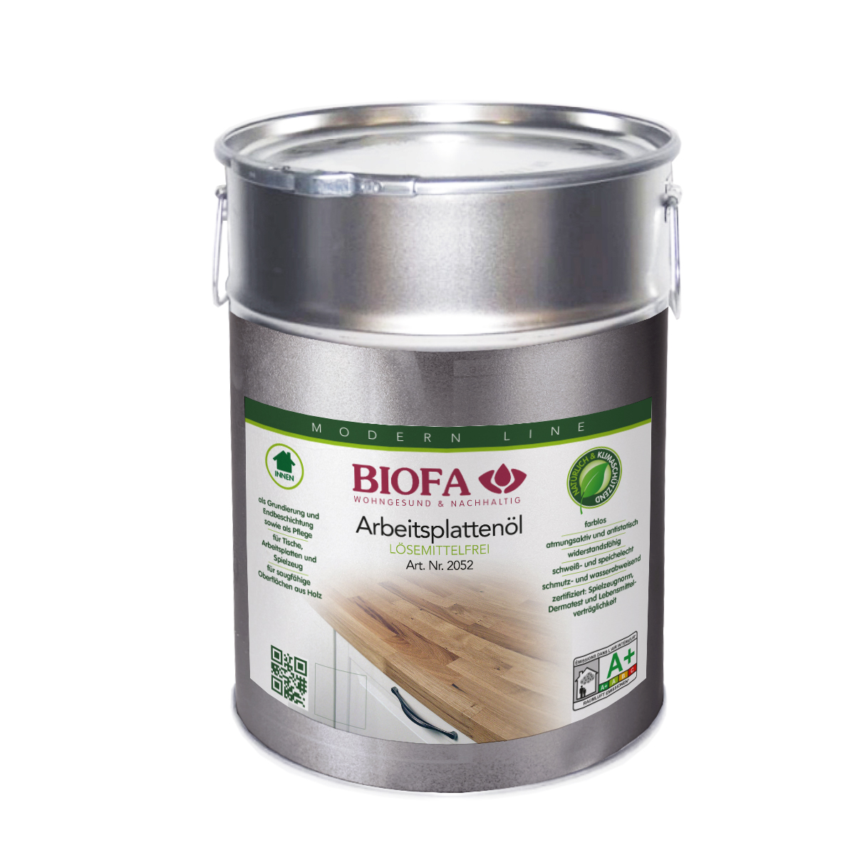 BIOFA Arbeitsplattenöl ist eine Grundierung, Endbeschichtung und Pflege für Tische, Arbeitsplatten und Spielzeug.